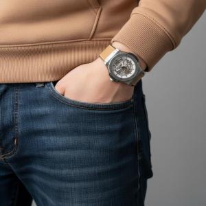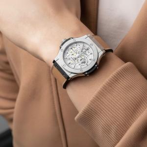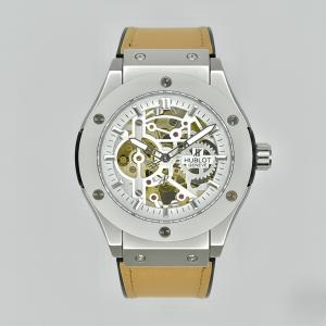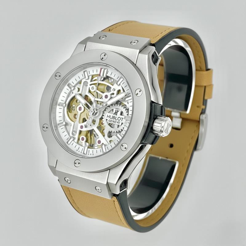 The Hublot Geneva watch showcased in the image is a striking example of horological craftsmanship and design. The watch boasts a silver-toned case that securely attaches to a brown leather strap via screws positioned at the top and bottom of the case. The dial of the watch is skeletonized, offering a glimpse into the intricate inner workings of the timepiece. The skeletal design reveals the gold-accented gears and mechanisms, adding a layer of complexity and visual interest to the watch's face. Red jewels are visible within the movement, adding subtle pops of color against the predominantly silver and gold tones.